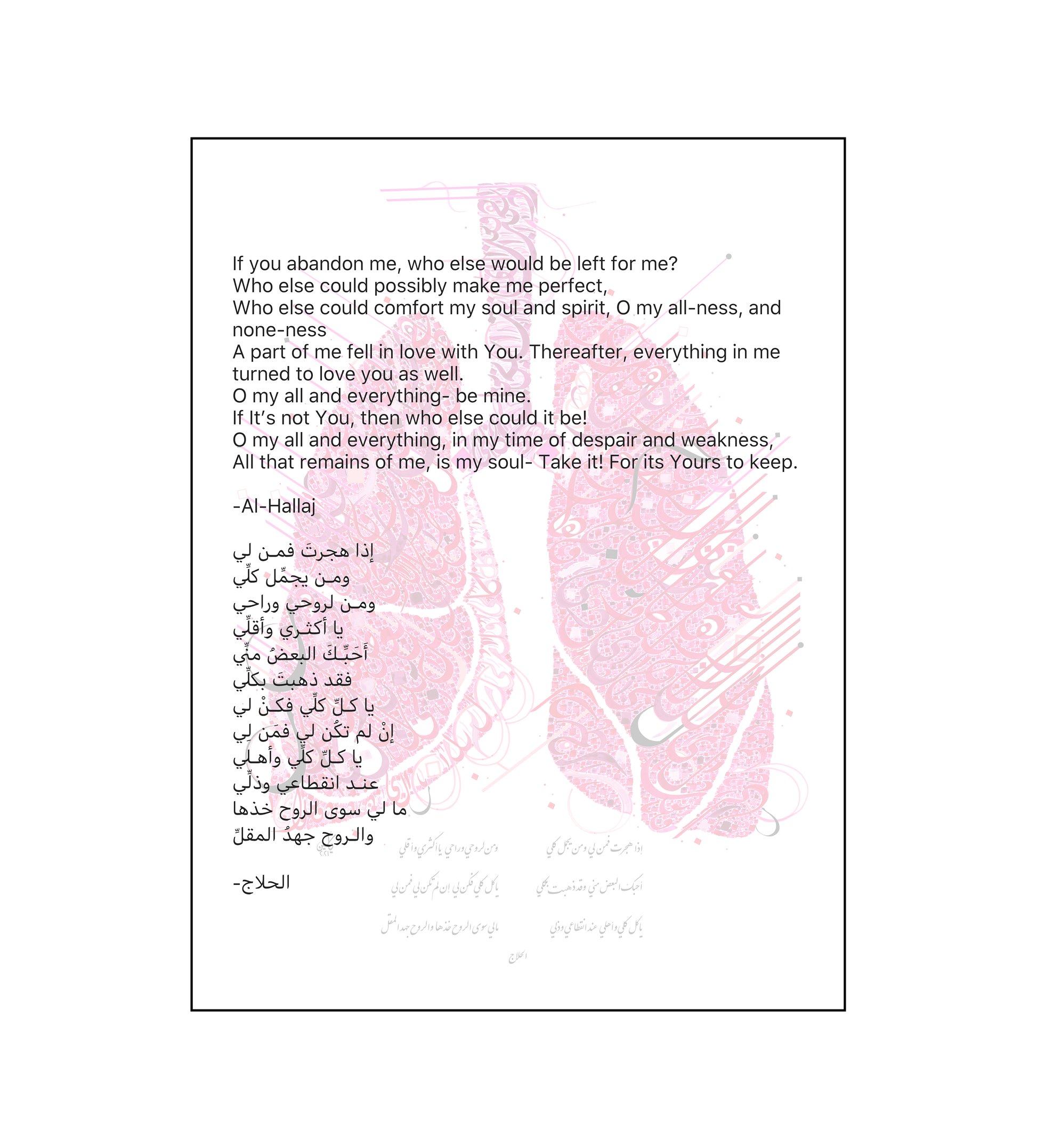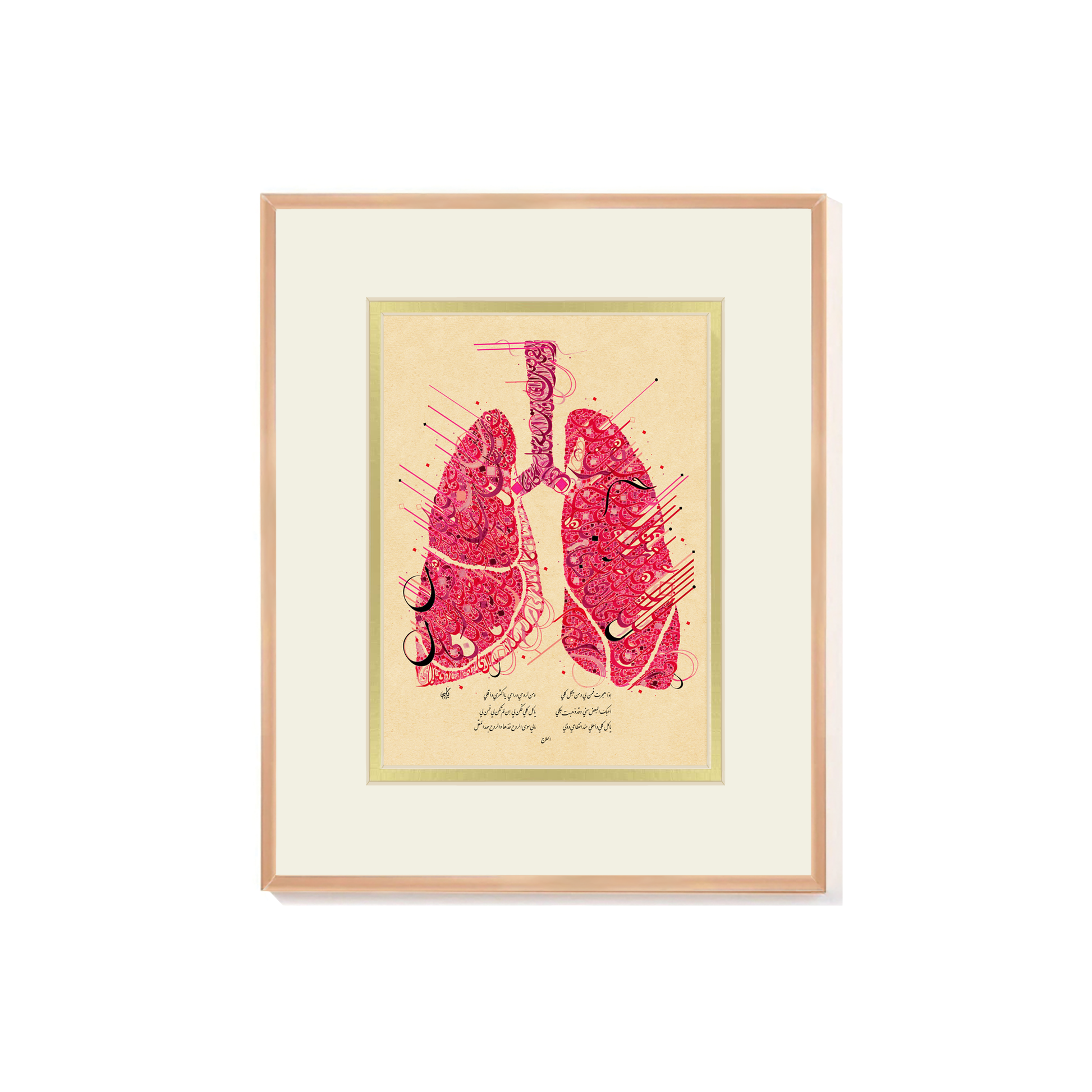 Arabic Calligraphy is used to capture Hallaj's poem, shaped as a pair of Anatomical Lungs. Composed in early September 2021.